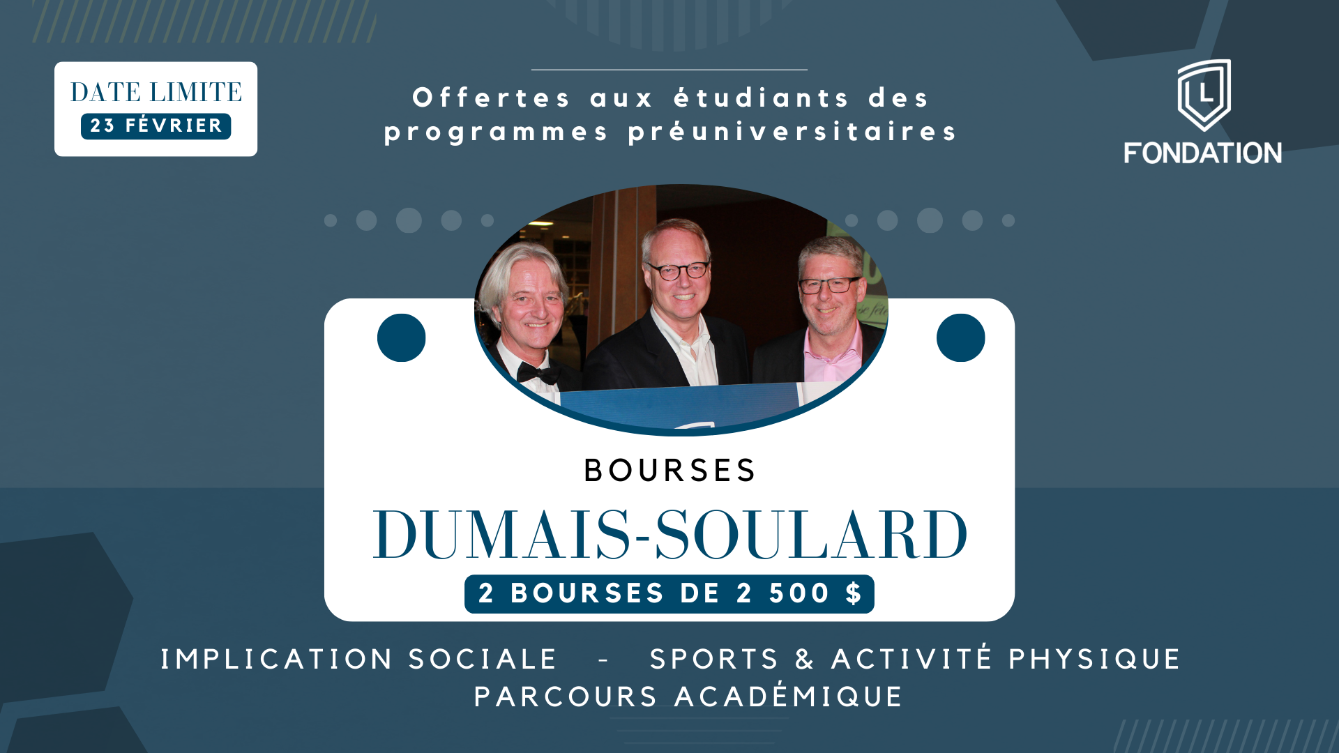 Tu as de bons résultats, tu es engagé dans ta communauté et tu pratiques un sport? Tu pourrais remporter l’une des deux bourses Dumais-Soulard de 2 500 $ chacune!