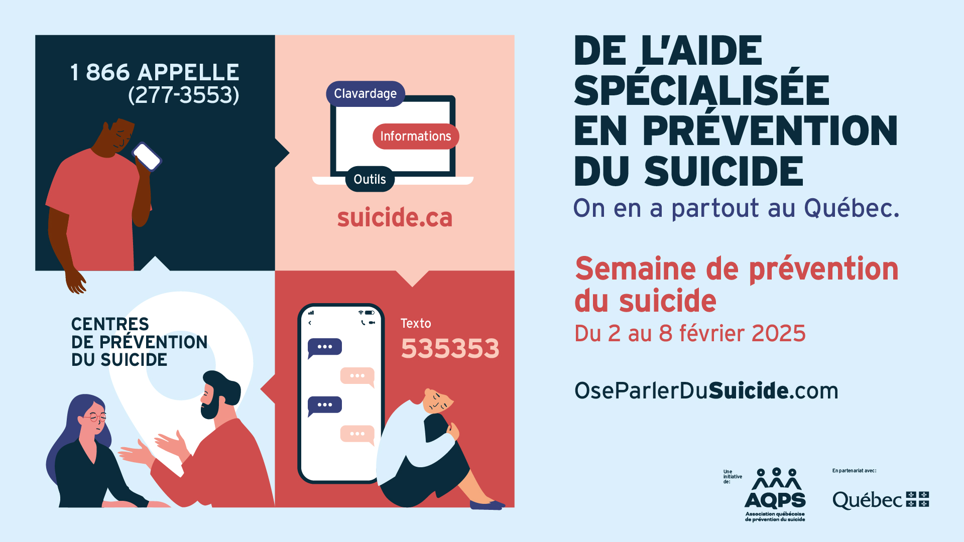 Pendant cette Semaine de prévention du suicide, brisons les tabous, parlons ouvertement du suicide et utilisons les nombreuses ressources d’aide spécialisée. Ensemble, nous pouvons faire une différence. Visitez OseParlerDuSuicide.com pour mieux comprendre le suicide, découvrir des témoignages et vous mettre en action.