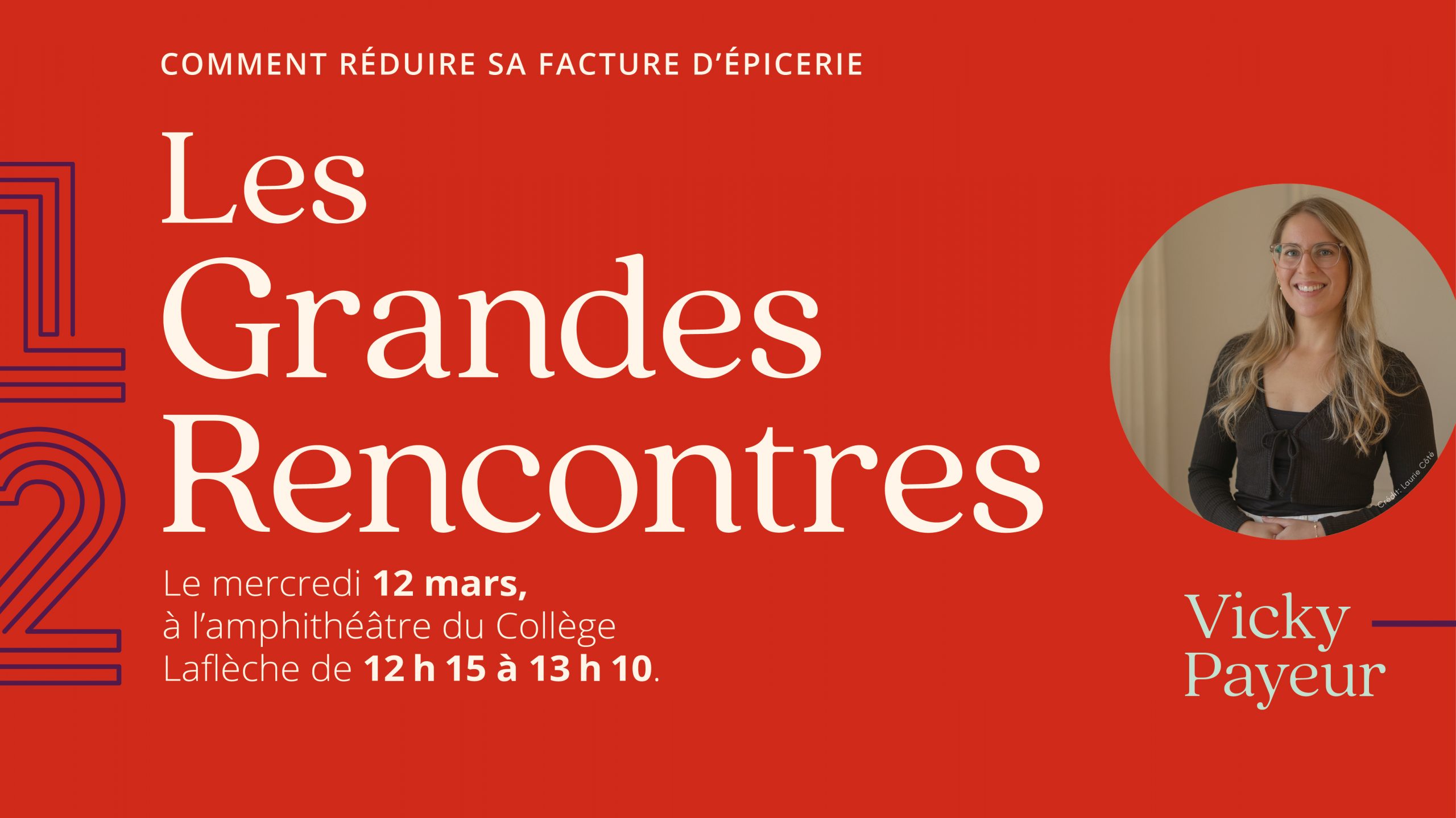 Les grandes rencontres et le Comité environnement et saines habitudes de vie vous invitent à une conférence gratuite avec Vicky Payeur : « Comment réduire sa facture d’épicerie ». Les personnes présentes obtiendront un coupon pour le tirage des 4 cartes-cadeaux qui seront tirées le 31 mars prochain.