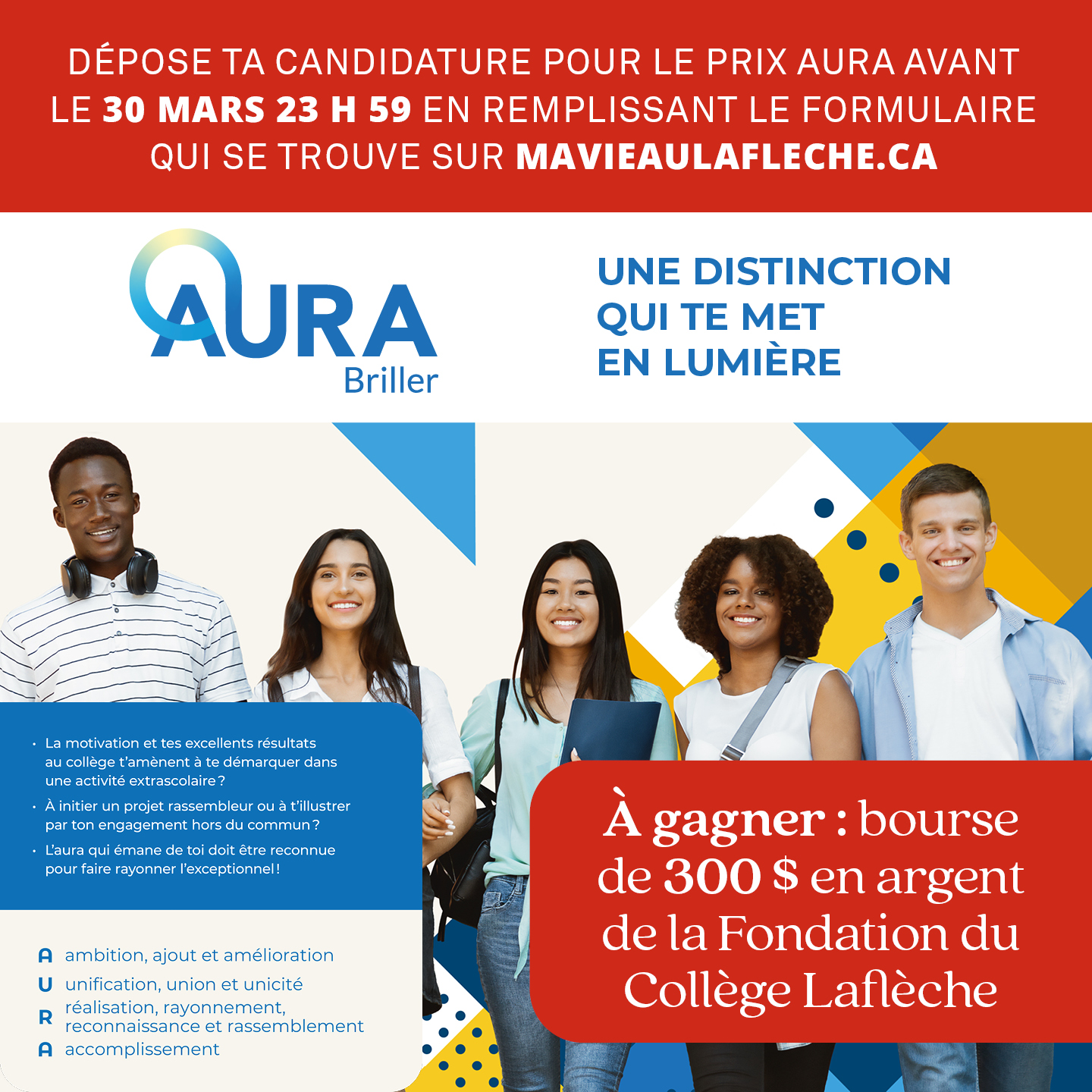 Les finissants sont invités à soumettre leur candidature au Prix AURA avant le 30 mars à 23 h 59 pour courir la chance de remporter une bourse de 300 $ offerte par la Fondation du Collège Laflèche. Déposer ma candidature