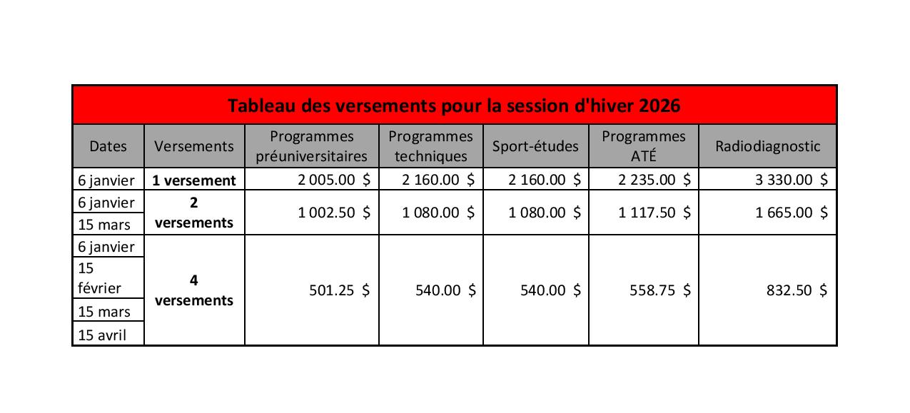 Pour avoir accès à ton horaire à partir du 8 janvier à 15 h, tu dois payer tes droits de scolarité (au moins un versement) au plus tard le mardi 6 janvier à 16 h 30. Si tu paies entre le 7 et le 11 janvier, nous ne pouvons garantir l’accès à ton horaire avant ta journée d’accueil. Voir le tableau des versements pour les montants, ainsi que les dates pour les chèques postdatés, plus bas.